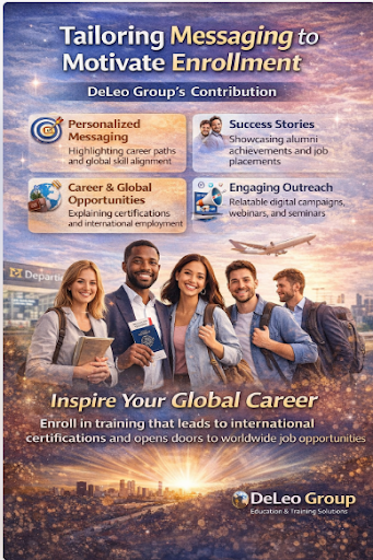 DeLeo Group motivates learners to enroll by crafting authentic and inspiring messages that highlight the real benefits of its training programs. By showcasing alumni success stories, certification achievements, and job placements, students can see the tangible impact of the programs. Personalized communication emphasizes career pathways and alignment with international standards, while transparent information on curricula, mentorship, and support allows learners to make informed decisions confidently. Engaging outreach through digital campaigns, webinars, and seminars ensures the messaging is relatable and motivating. Through this approach, DeLeo Group builds trust and inspires students to pursue training that opens doors to global career opportunities.